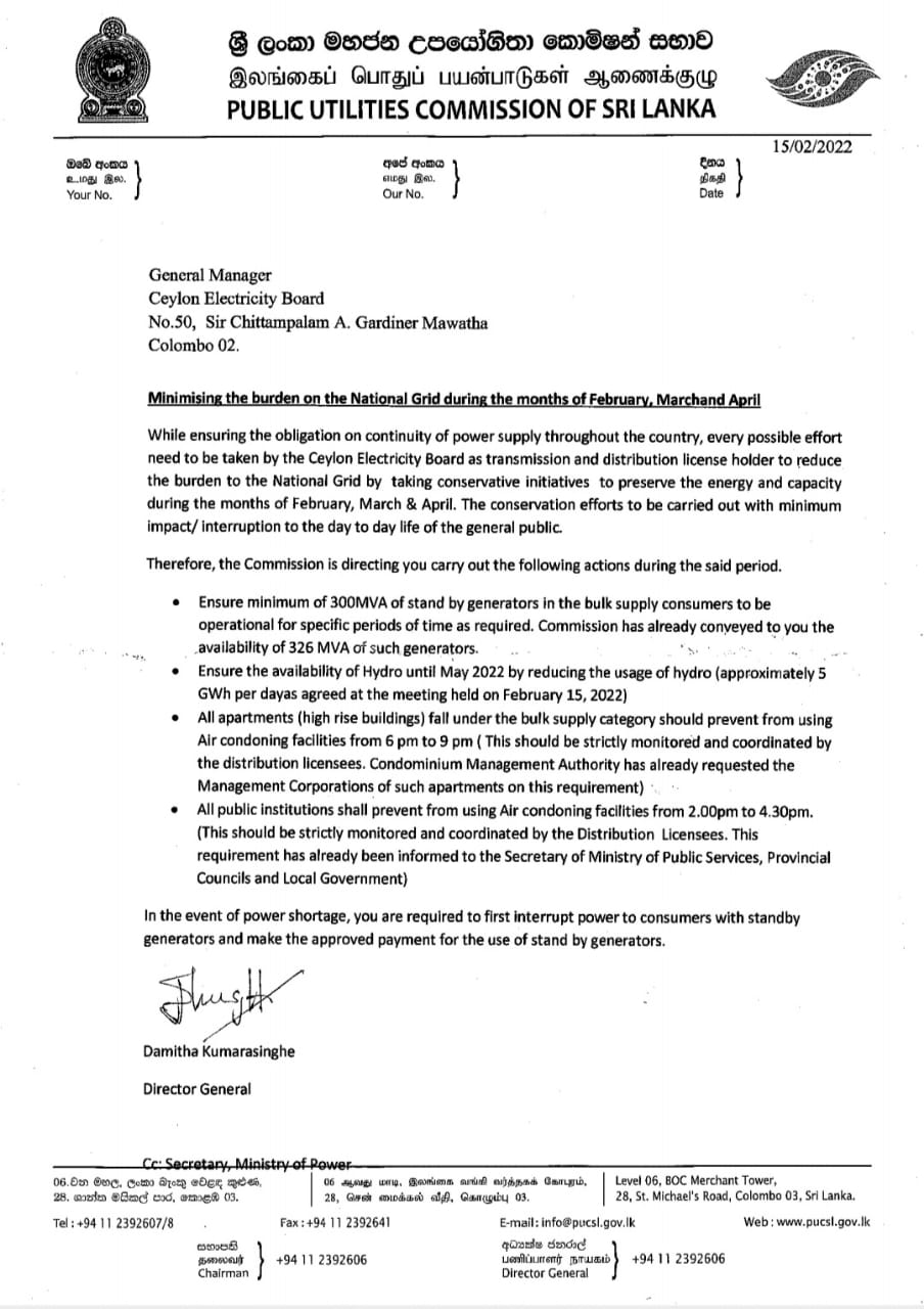 Issuing a statement, the PUCSL said while ensuring the obligation on continuity of power supply throughout the country, every possible effort needs to be taken by the CEB to reduce the burden to the National Grid.