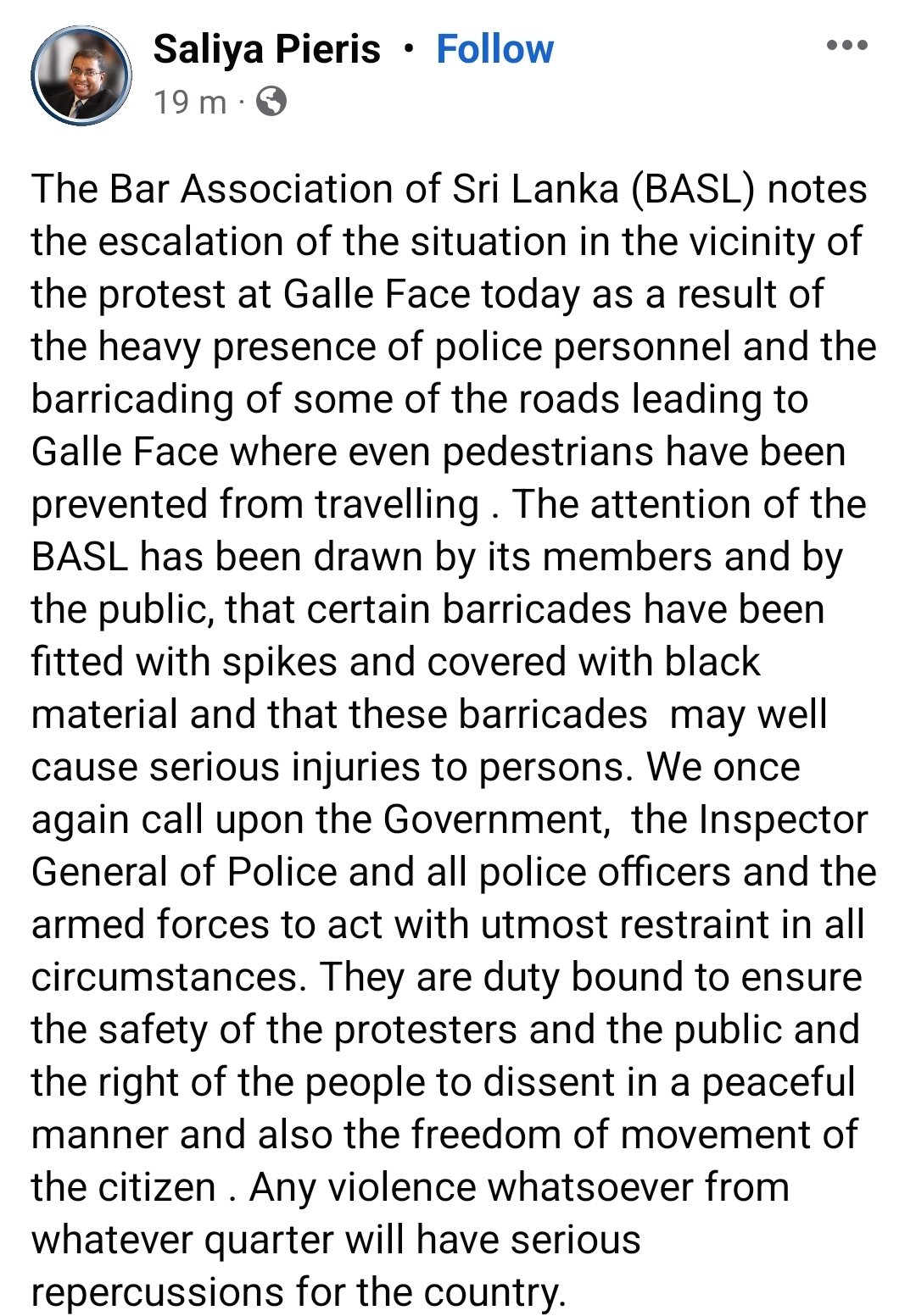 Bar Association President Saliya Pieris has issued a strong statement condemning barricading of roads & barricades being fitted with spikes by Police.