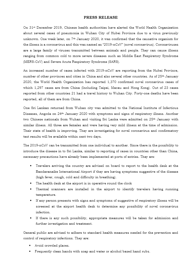 • Travelers arriving the country are advised on board to report to the health desk at the Bandaranaike International Airport if they are having symptoms suggestive of the disease (high fever, cough, cold and difficulty in breathing).