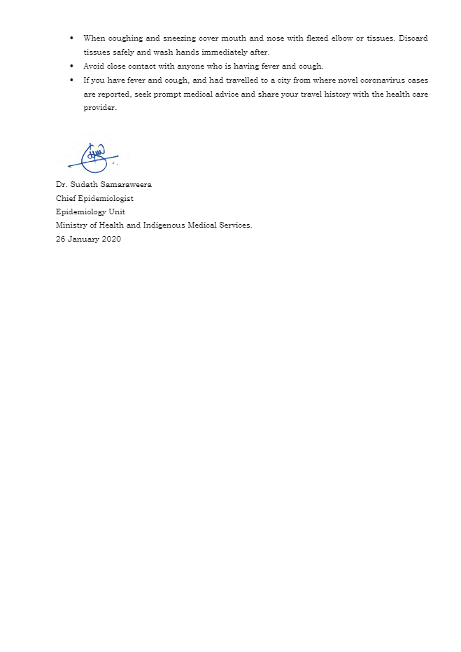 Sri Lanka’s Epidemiology Unit advises the public to adhere to standard health measures needed for the prevention and control of respiratory infections in order to reduce the risk of novel coronavirus infection.