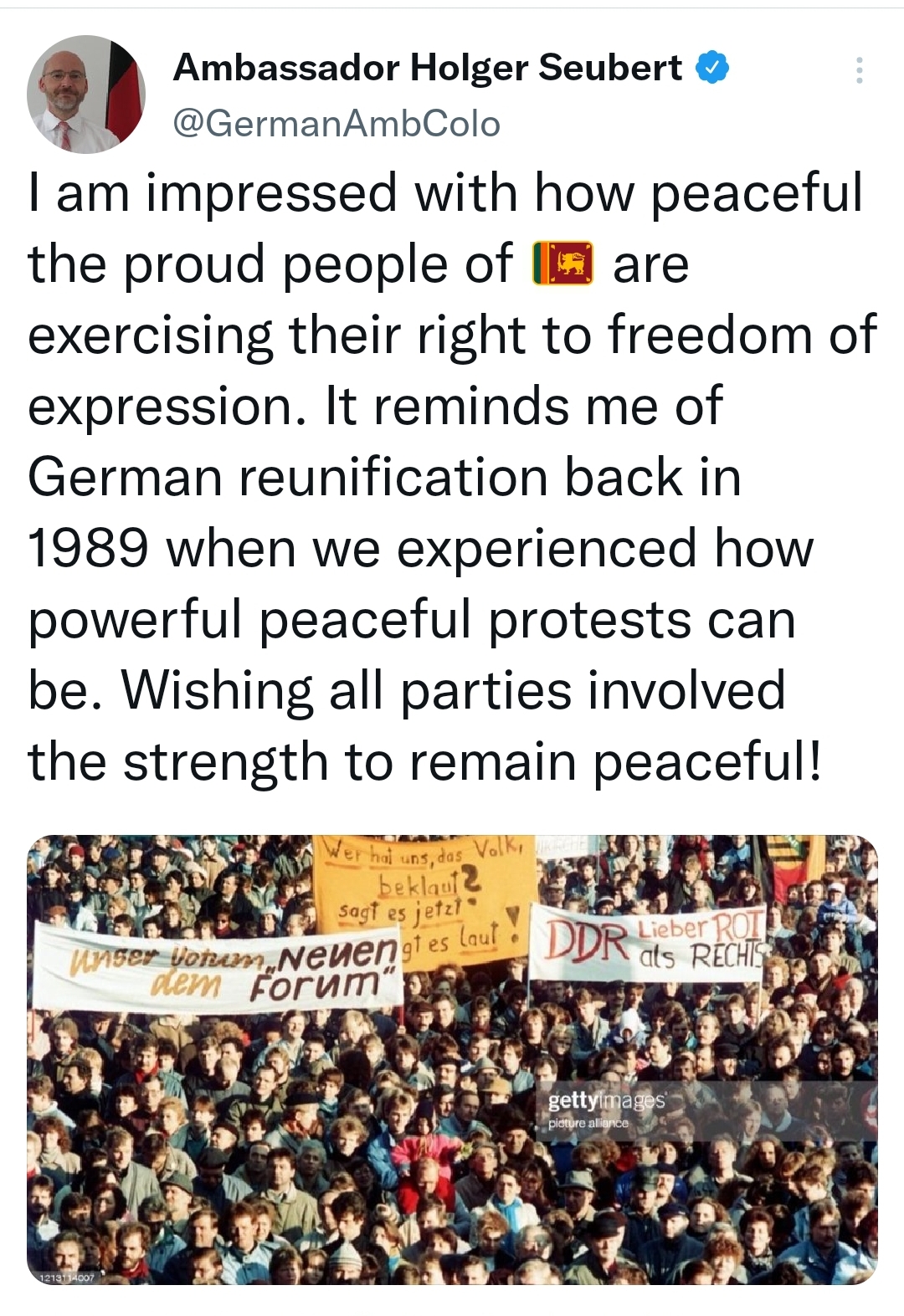 The ambassador said that It reminds him of the German reunification back in 1989 when the country experienced how powerful peaceful protests can be.