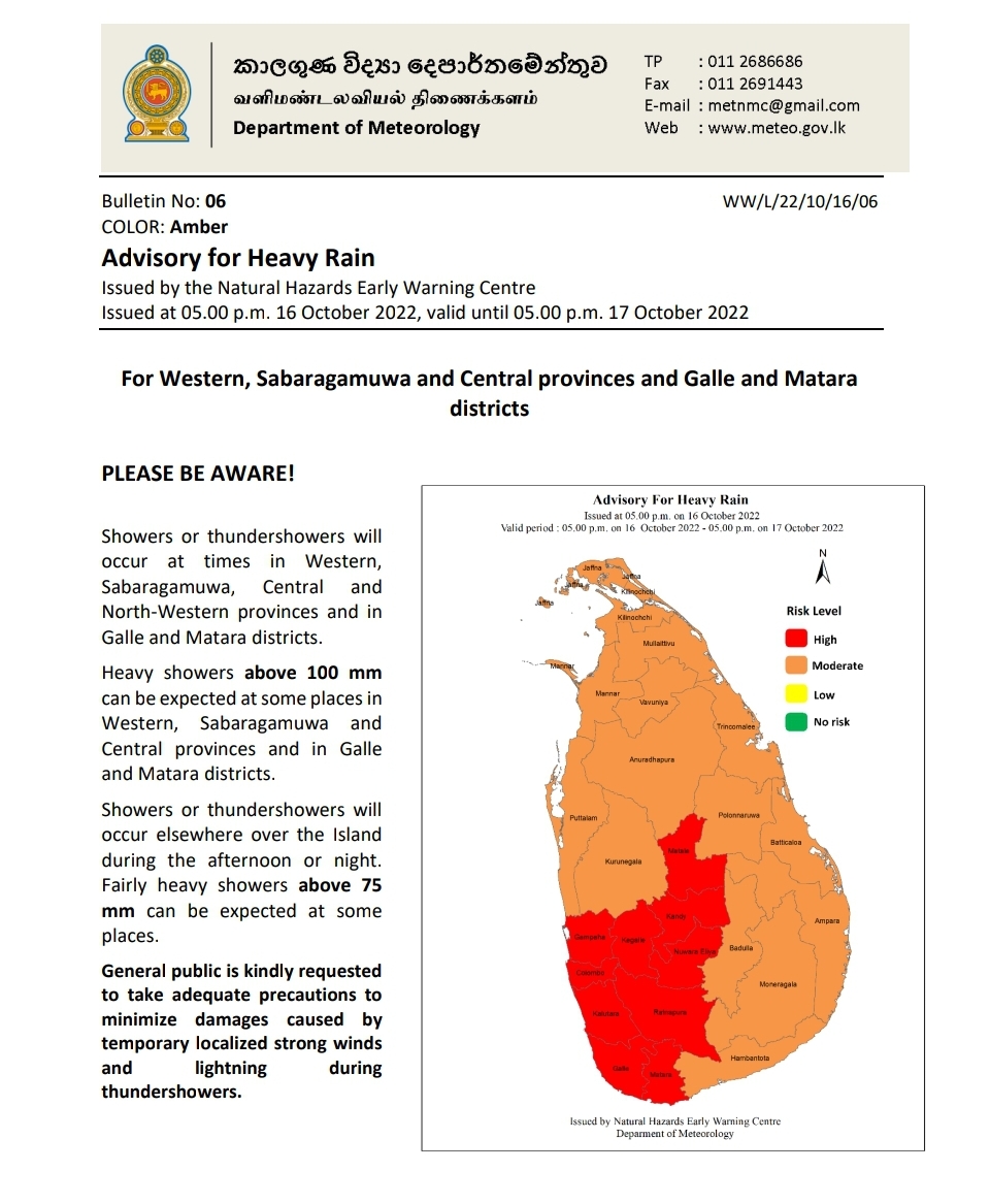 Heavy showers above 100 mm can be expected at some places in Western, Sabaragamuwa and
