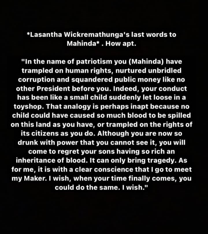 HomeMain StoryLasantha Wickrematunge’s Last Words Lasantha Wickrematunge’s Last Words 10/05/202210/05/2022byCeylon Independent Post Views: 1,035