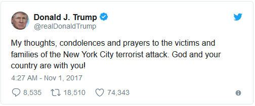 President Donald Trump tweeted: “My thoughts, condolences and prayers to the victims and families of the New York City terrorist attack. God and your country are with you!”