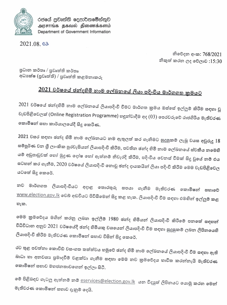 Further details can be obtained by logging onto https://eservices.elections.gov.lk/ for further details regarding the registration process.