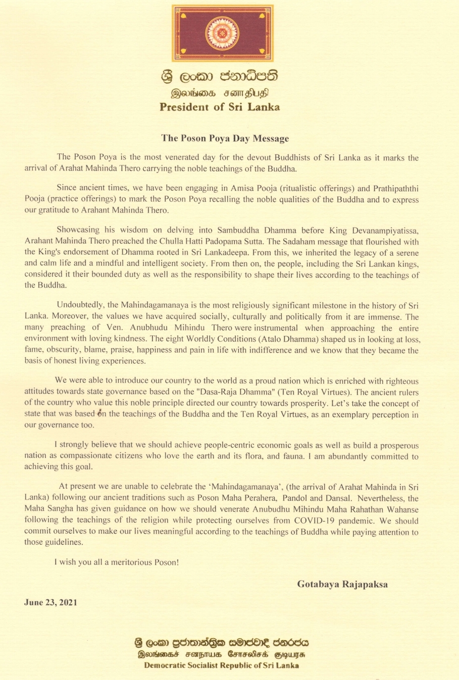 The Poson Poya Day Message – President Gotabaya Rajapaksa