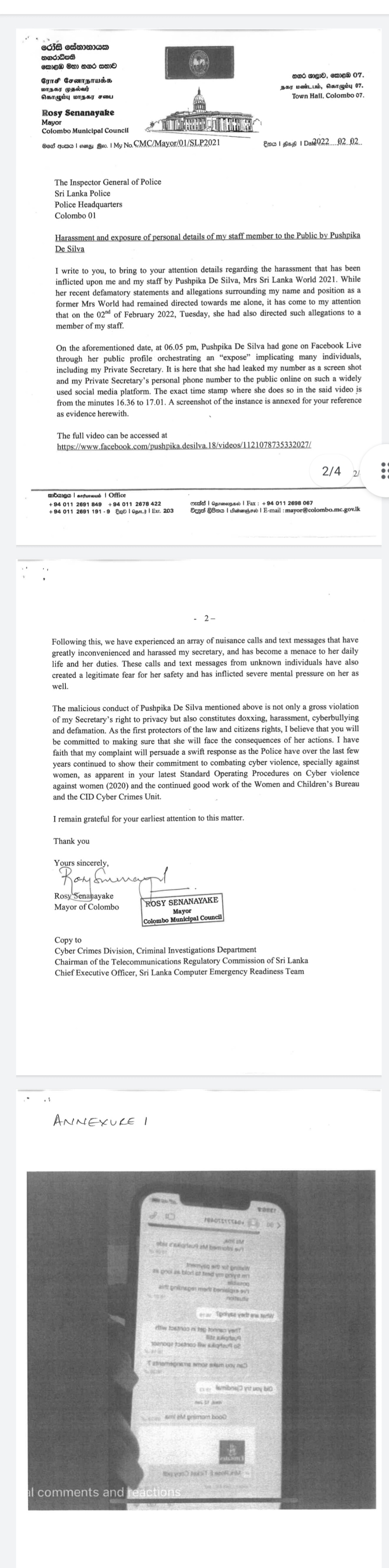 Colombo Mayor Rosy Senanayake has sent a letter of demand requesting 500 million rupees in damages from Pushpika de Silva.