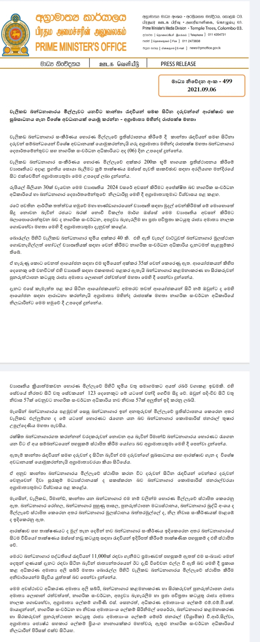 The Government previously announced that the prison complex will be moved to 200 acres of land in Millewa, Horana by 2024 at a cost of Rs 30 billion.