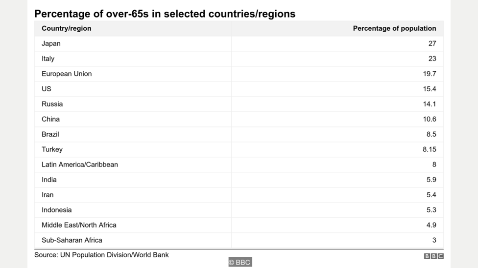 Better standards of life mean people “last longer” in these countries. A prime example is Japan, where life expectancy at birth is nearly 84 years (the world’s highest national rate) and where the over-65s amounted to 27% of the total population in 2018 – also the most in the world.