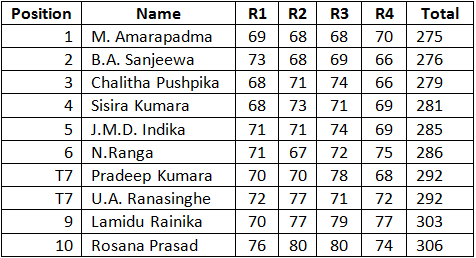 Young Chalitha Pushpika showed his potential by equaling the best round of the tournament of 66 to grab the bronze from Sisira Kumara who completed with a competitive 2 under 69 on a day of excellent golf which saw 7 players breaking par.