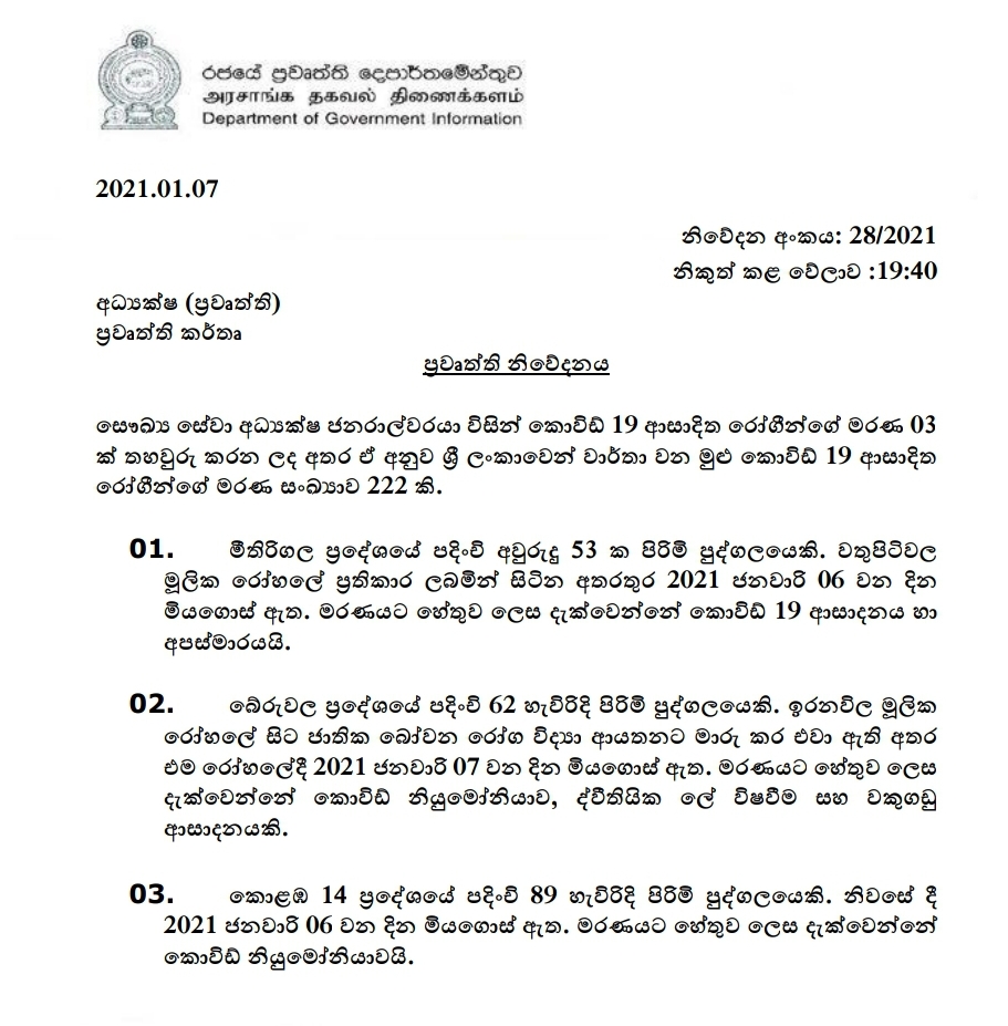 HomeNEWSLocal3 CV-19 deaths reported yesterday (07) 3 CV-19 deaths reported yesterday (07) 07/01/2021byAyman Ameer Three more Covid-19 related deaths were reported in the country yesterday (Jan 07) increasing SriLanka’s death toll to 222. Post Views: 486