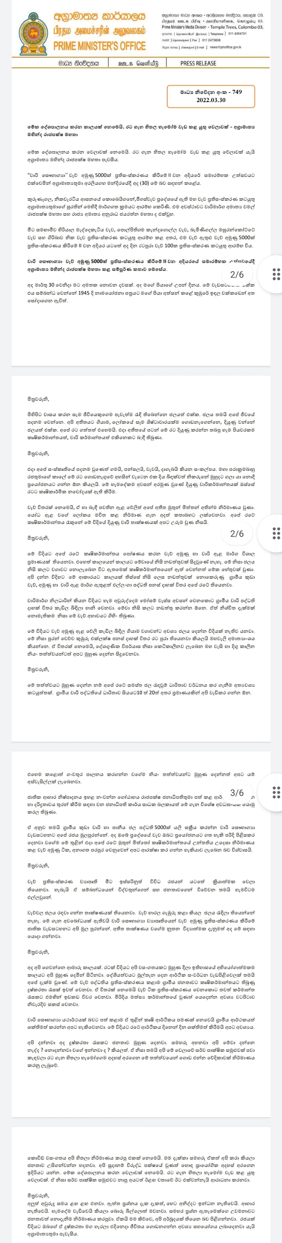Prime Minister Mahinda Rajapaksa today addressed the persisting crises in Sri Lanka.