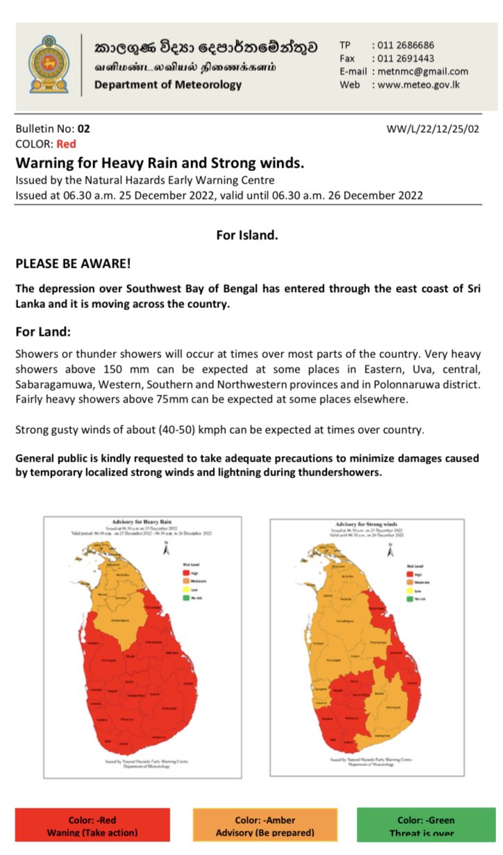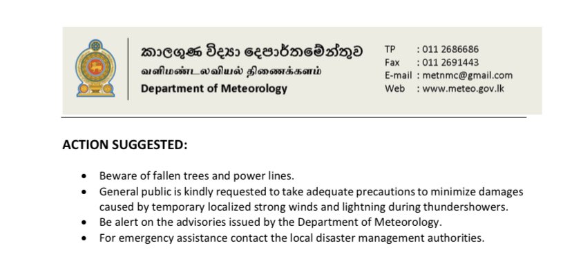 Showers or thunder showers will occur at times over most parts of the country. Very heavy showers above 150 mm can be expected at some places in Eastern, Uva, central,Sabaragamuwa, Western, Southern and Northwestern provinces and in Polonnaruwa district.