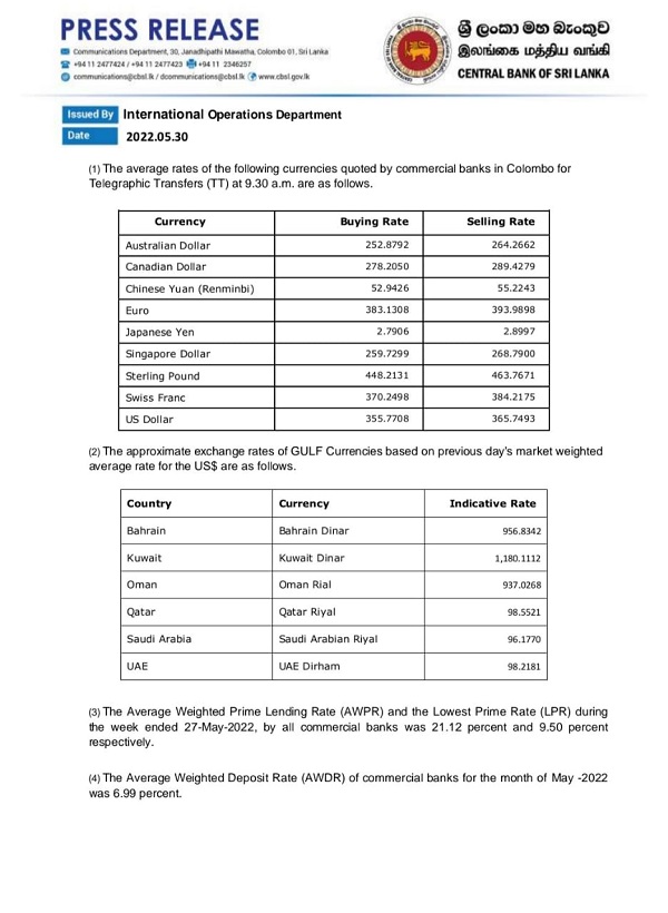 The bank said the rupee has depreciated by Rs. 1, with the selling rate of the US Dollar being declared as RS. 365. 74.