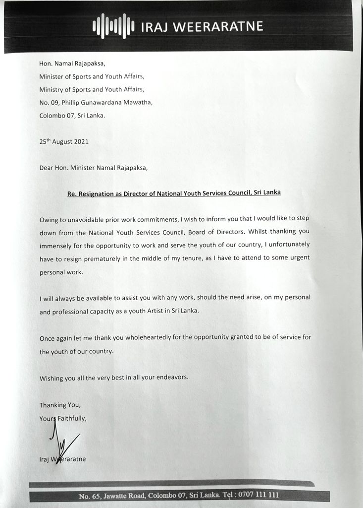Local musician Iraj Weeraratne has resigned from the National Youth Services Council.