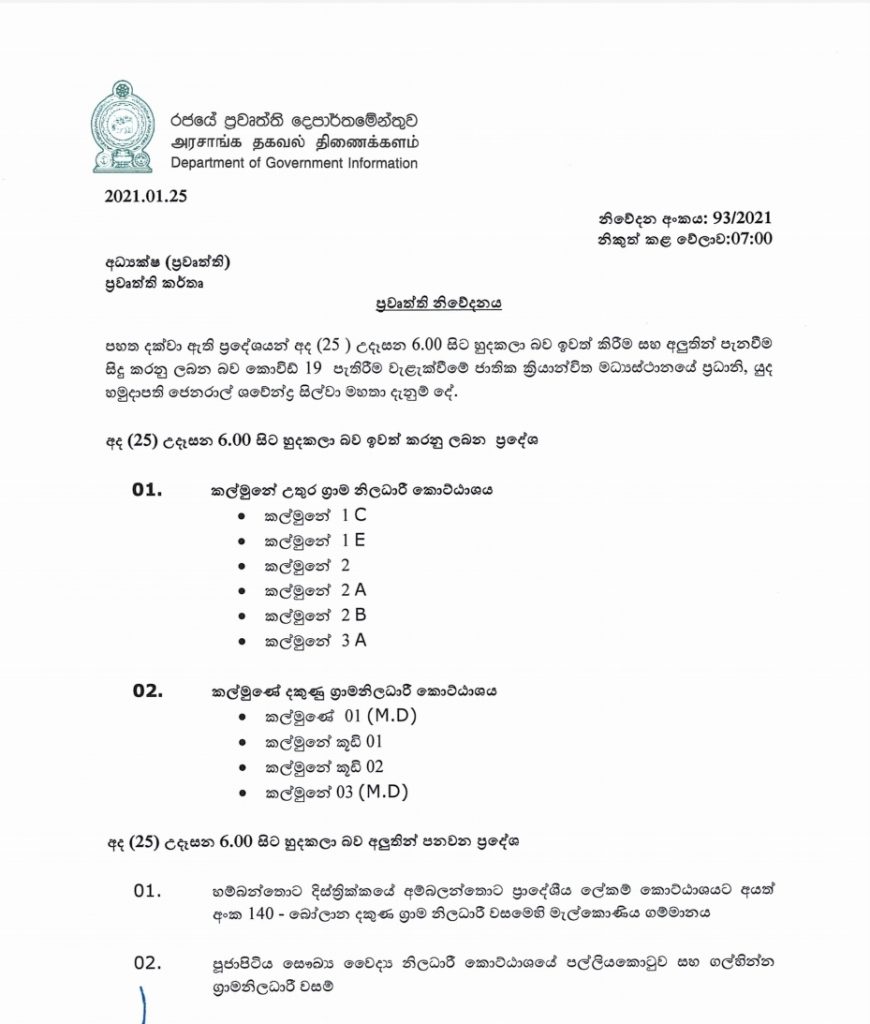 As of 6 am today, 06 areas in Kalmunai-North and 04 areas in Kalmunai-South have been released isolation.