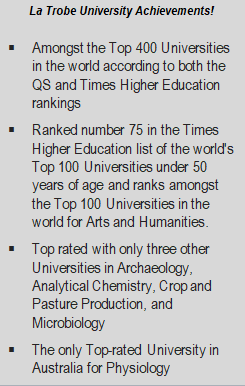 Ranked within the top 1.4% of world universities, La Trobe University is a multi-campus university in Victoria, Australia and has been one of Australia’s pioneering universities offering distinctive and high-quality degrees that equip students to understand and engage with the global issues of today, providing graduates with the skills to embark on rewarding careers.