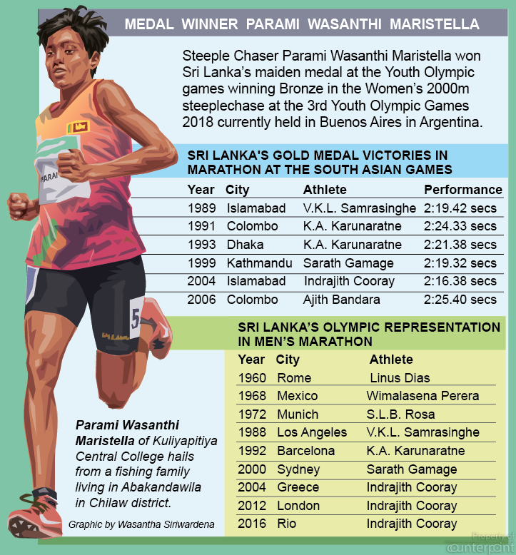 Almost seven decades after making its debut at an international sports event as an independent country, Sri Lanka won its first medal in an endurance event, when Paarami Wasanthi of Kuliyapitiya Central clinched a bronze at the Youth Olympics in Buenos Aires in October 2018. With the schools track and field structure largely encouraging development of sprinters, doesn’t this against-odds victory in the long distance event point to where the country should have its focus on to win at international level?