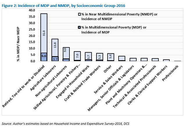 More than half of the people who are either in MDP or NMDP belong to this group. The other three SEGs with high shares of MDP or NMDP consist of households headed by agricultural labourers, non-agricultural labourers and skilled agricultural, forestry, and fishery workers. These four groups accounts for nearly 80% of those in MDP or NMDP.