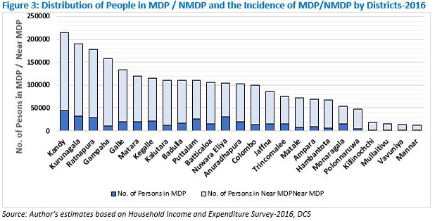 Figure 3 shows that the number of persons in NMDP in almost all districts is considerably high compared to those in MDP. This indicates that, although the incidence of MDP is low in Sri Lanka, a large number of people are at risk of slipping into MDP.