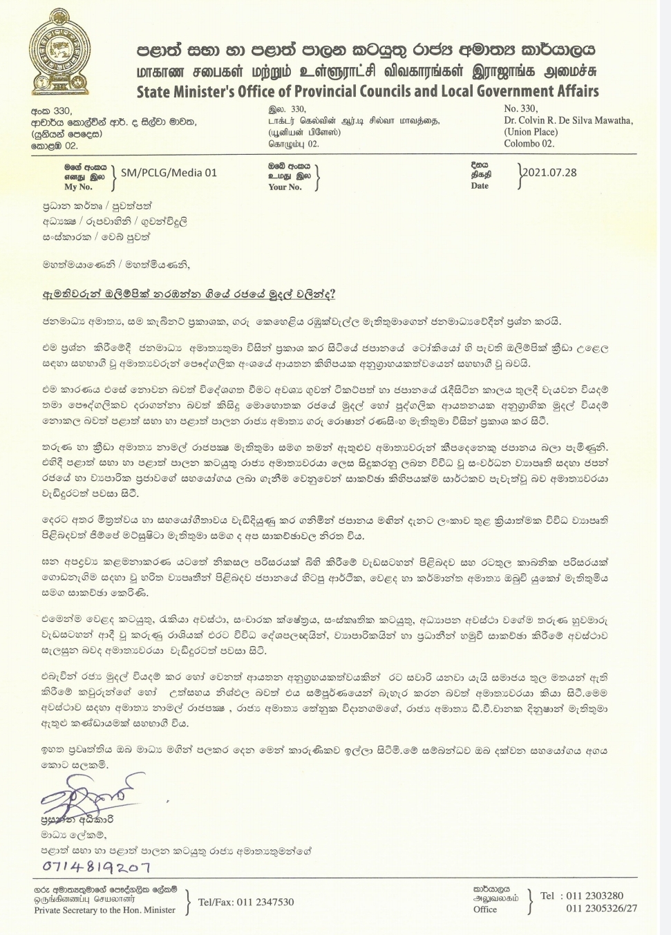 State Minister Roshan Ranasinghe has issued a statement denying refuting the claims denying that he used the private sponsorship to travel to Tokyo Olympics and stating that he traveled to Olympics at his personal expense.