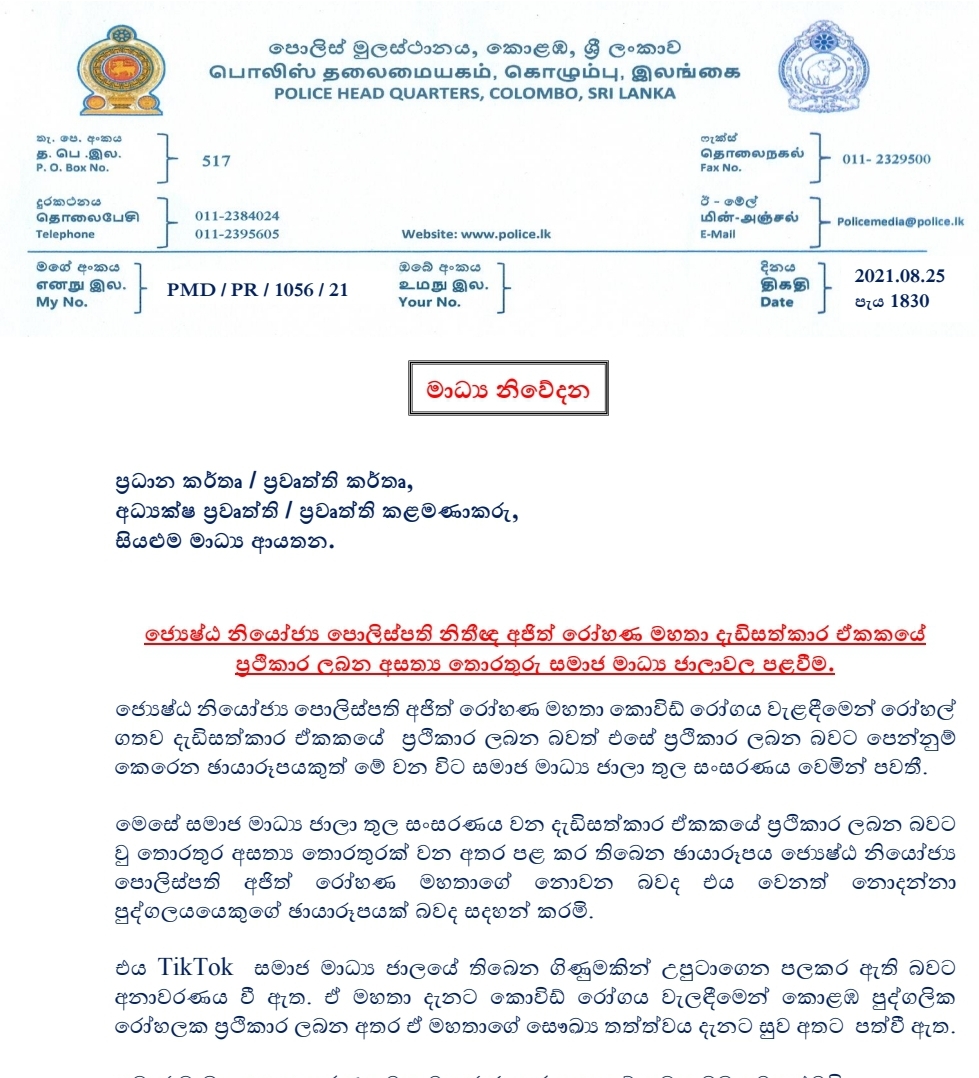 HomeTOP STORYPolice clarifies false claims on SDIG Ajith Rohana’s health Police clarifies false claims on SDIG Ajith Rohana’s health 25/08/2021byAyman Ameer Images circulating on social media claiming Senior Deputy Inspector General Ajith Rohana is receiving treatment at an ICU are false, Sri Lanka Police said issuing a statement on Wednesday (25 Aug). Post Views: 1,004
