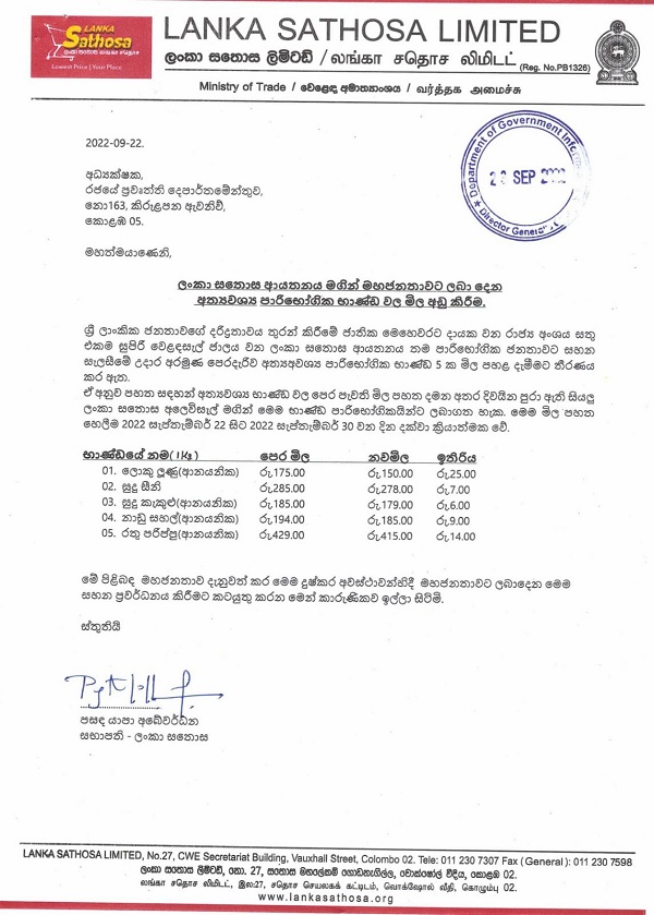 Lanka Sathosa has announced the reduction of the price of five essential items.