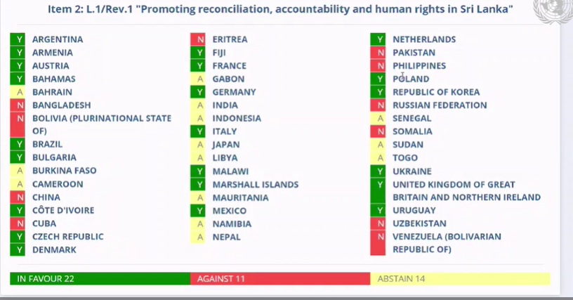 HomeNEWSLocalUNHRC resolution on Sri Lanka passed UNHRC resolution on Sri Lanka passed 23/03/2021byAyman Ameer The UN Core Group resolution against Sri Lanka adopted at the 46th UNHRC Session. favour: 22 Against: 11 Abstained: 14 Post Views: 391