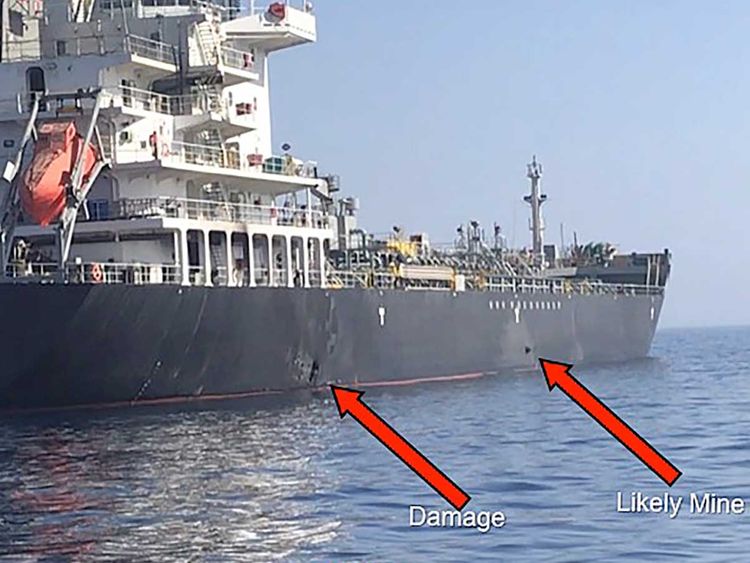 The US military also released a photo it claimed showed a mine on the side of the Kokuka Courageous and some damage to the hull.